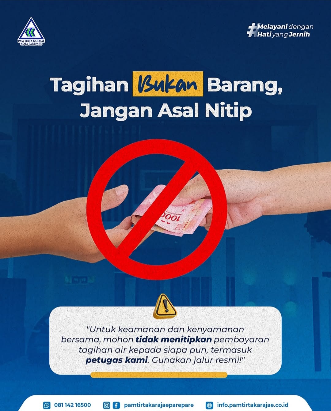 Humas PAM Tirta Karajae Parepare, Erfendi Rasyid mengatakan, pentingnya edukasi ini untuk melindungi kepentingan pelanggan. “Tagihan BUKAN Barang, Jangan Asal Nitip”. Ini dikeluarkan sebagai upaya pencegahan terhadap potensi penyalahgunaan yang dapat merugikan pelanggan, kami PAM Tirta Karajae juga menekankan bahwa untuk keamanan dan kenyamanan bersama, masyarakat sebaiknya menghindari menitipkan pembayaran tagihan air kepada siapa pun, termasuk petugas lapangan. Gunakan jalur resmi agar transaksi lebih aman, tercatat dan terverifikasi. Sebab pembayaran melalui jalur resmi, memberikan jaminan keamanan yang lebih baik bagi pelanggan.